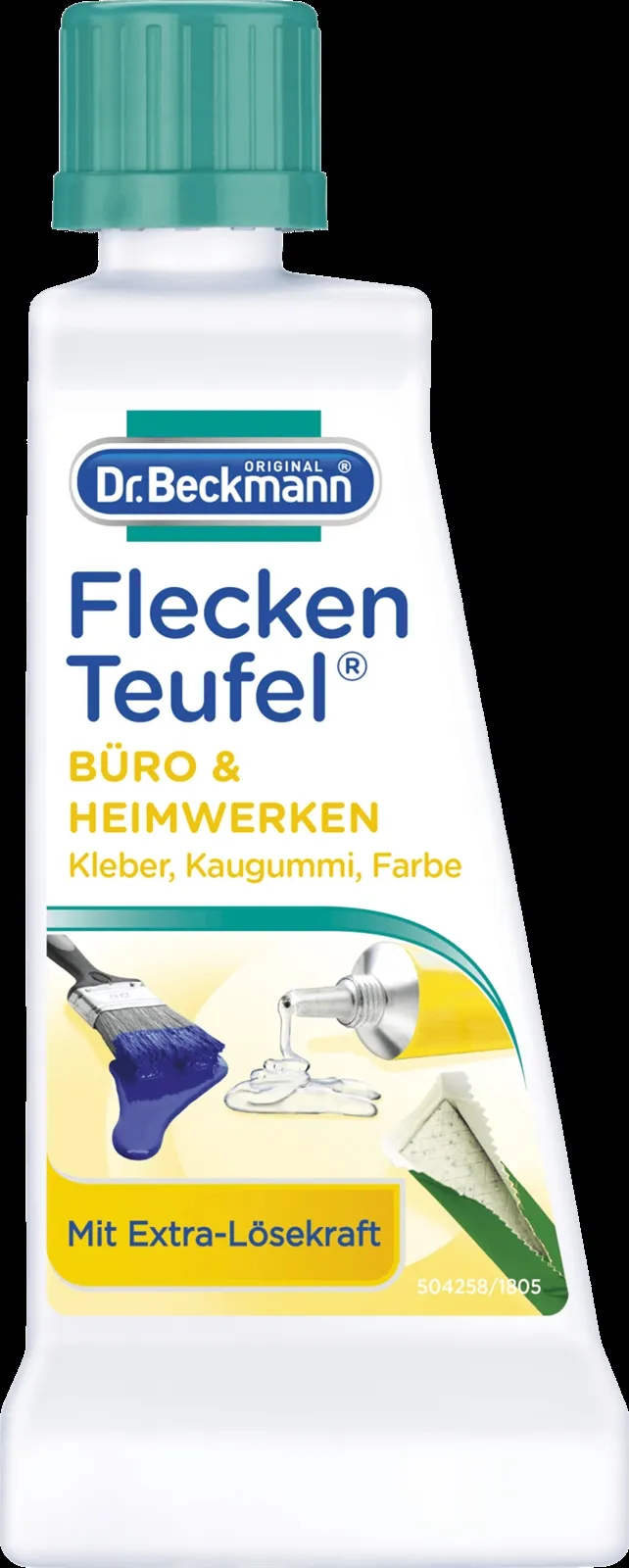 Dr. Beckmann Fleckenteufel Büro & Heimwerken usuwa z ubrań gumę do żucia, klej, farbę, plamy z wkładów do drukarek i plamy z lakieru do paznokci. Jest łagodny dla kolorów i tkanin. Nadaje się do tekstyliów, które można prać i nie prać.
