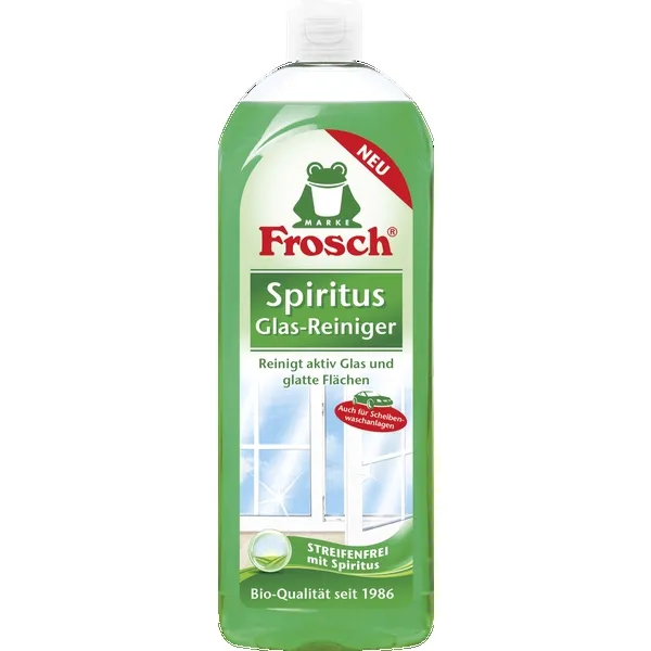 Środek do czyszczenia szkła Frosch Spiritus opiera się na swoim aktywnym składniku, silnym i aktywnym spirytusie rozpuszczającym tłuszcz, który wypróbowany i przetestowany przez dziesięciolecia, zapewnia w ten sposób czyszczenie bez smug i genialną czystość szkła i gładkich powierzchni w naturalny sposób.