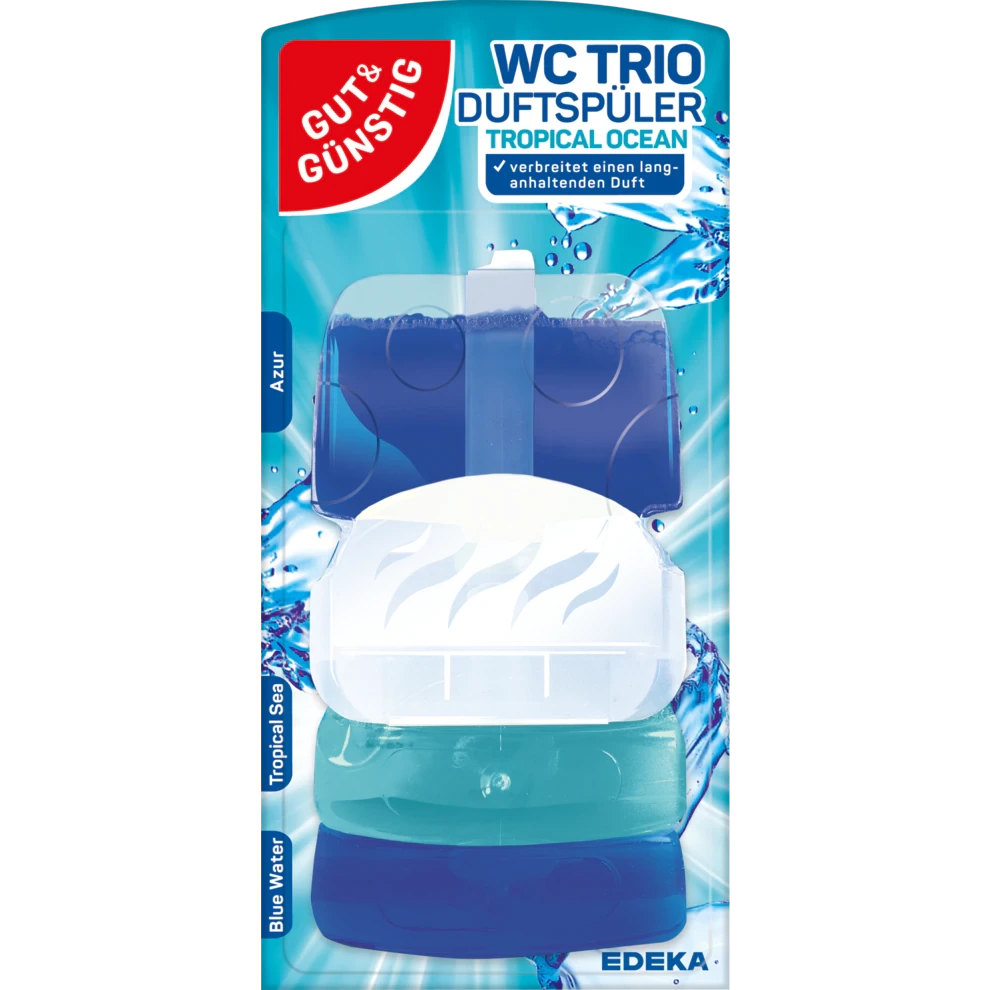 Zainwestuj w WC Trio Duftspüler Tropical Ocean, aby cieszyć się nie tylko czystością, ale też tropikalną świeżością w każdym użyciu.